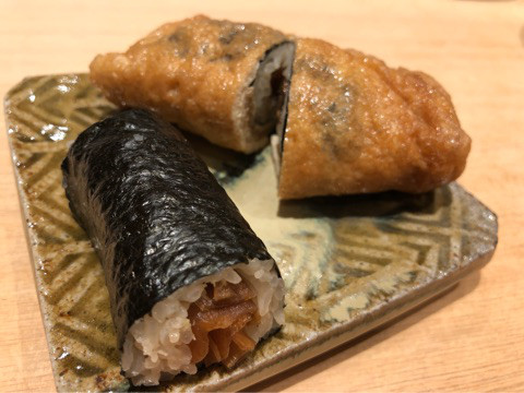 干瓢巻きの細巻きを作り、半分はそのまま。残り半分は、こだわりのお揚げに入れて、おいなりさんに。