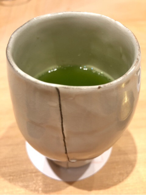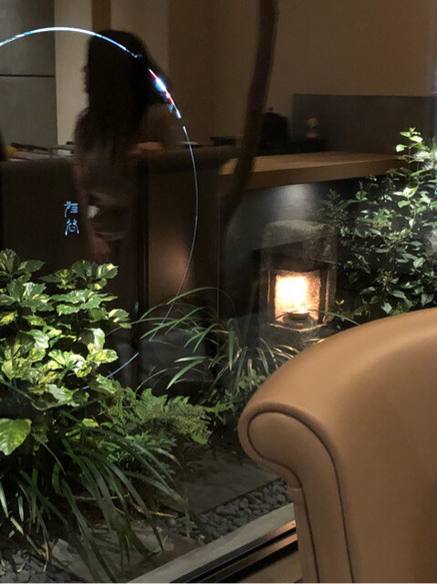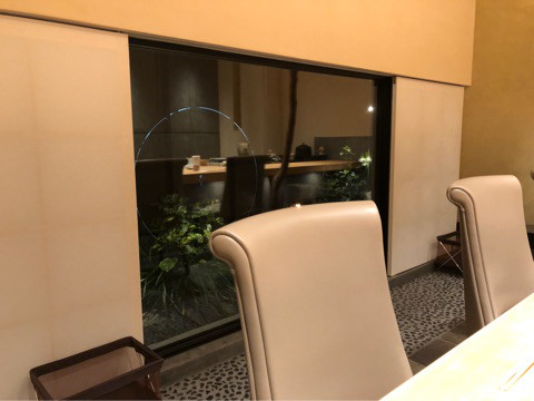 店内に入ると、カウンター6席のみの贅沢な空間が広がっていて、外からは見えないのですが、お店の中から中庭が見えています。荷物籠には入りきらない大きなカバンを持っていたのですが、さりげなく床に布を敷いてからその上にカバンを置いてくれる気遣いにまず驚きました。