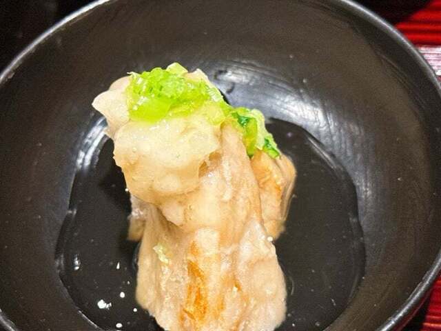 豆乳を温めた湯葉、べっ甲餡がかかっていて、山葵がいいアクセントに。