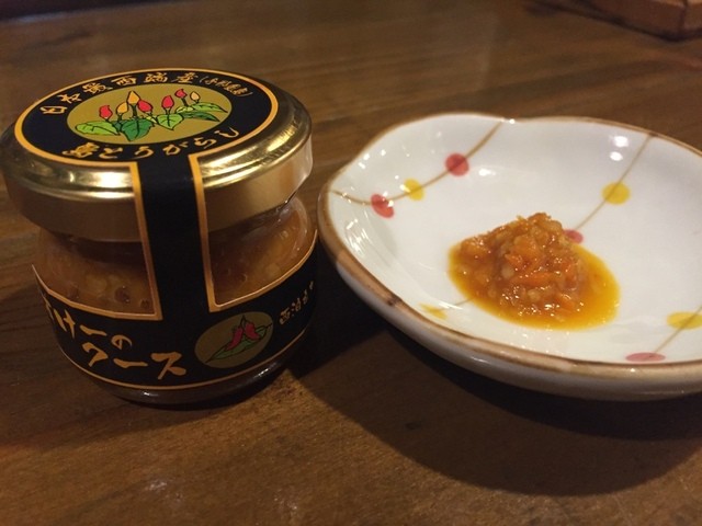 こちらは何をつけるのが良いか。それは与那国産の島唐辛子です。唐辛子を泡盛につけて発酵させ辛味を凝縮した調味料です。この何とも言えない島唐辛子の発酵した旨み。南の島の最高に料理に合うスパイスです。
