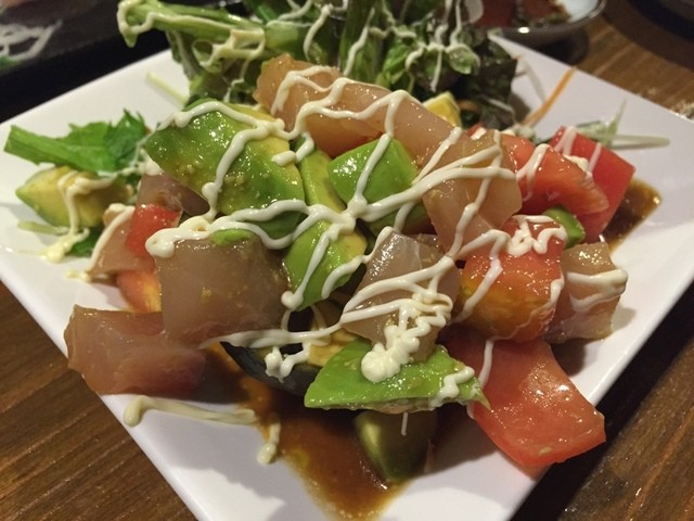 かじきアボガドもすぐれた逸品です。かじきの刺身とアボガド、とまとをしょうゆドレッシングで和えたものです。見映えも実にきれいで、こちらの料理人のセンスは味も飾り付けもピカ一です。
