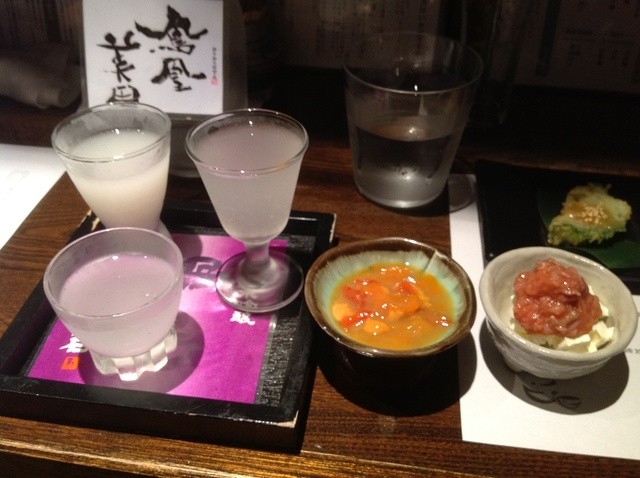 にごりの3種セットをほやの塩辛と酒盗チーズを合わせます。