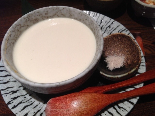 自家製のお豆腐です。くみ上げ豆腐に近いです。藻塩で頂きます。
