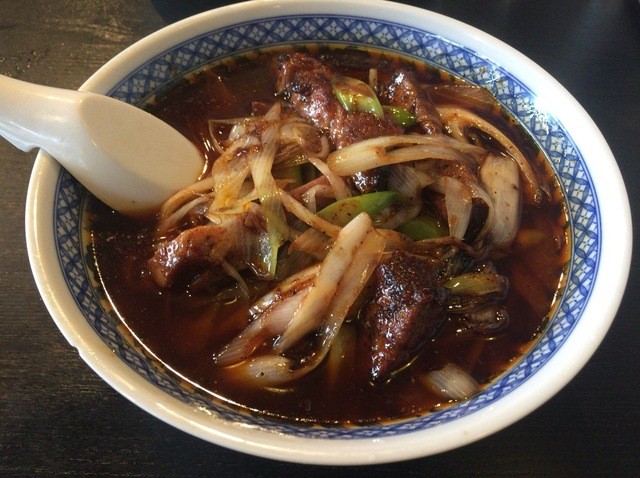 ④ネギのスライスにスープがまとわりつき、甘辛スープとネギの辛味が良くマッチする。