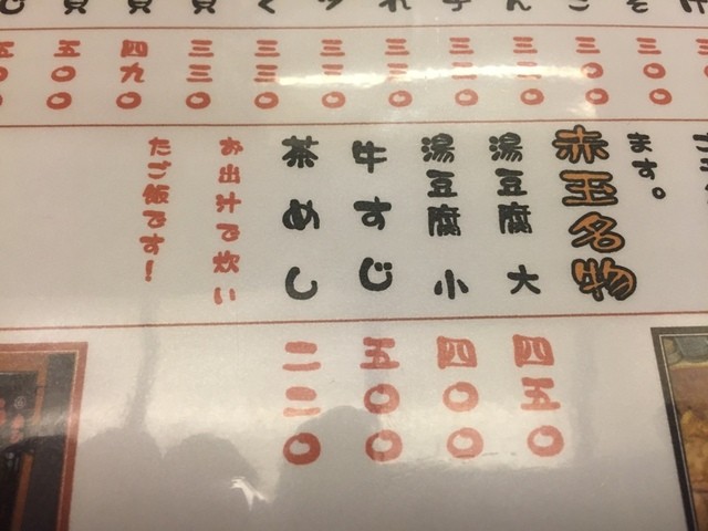 その中で赤玉名物は、牛すじ、湯豆腐、茶めしです。