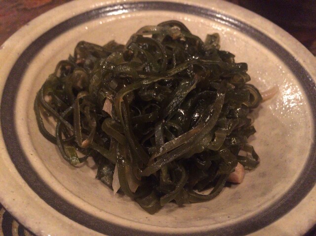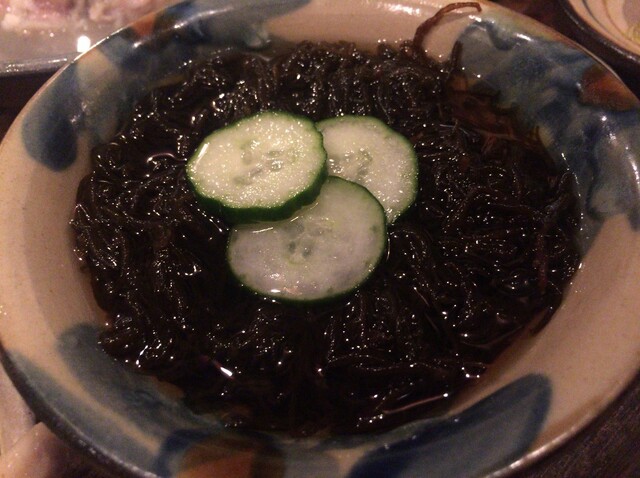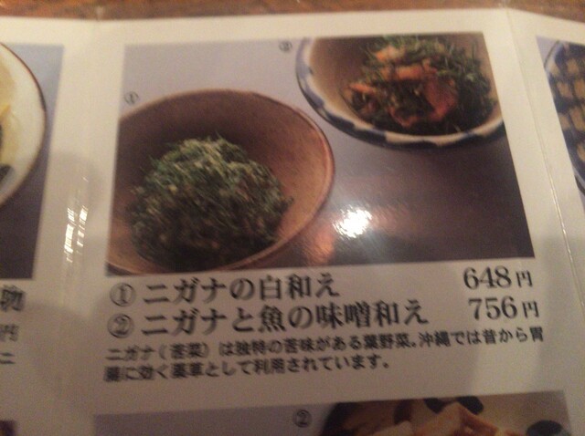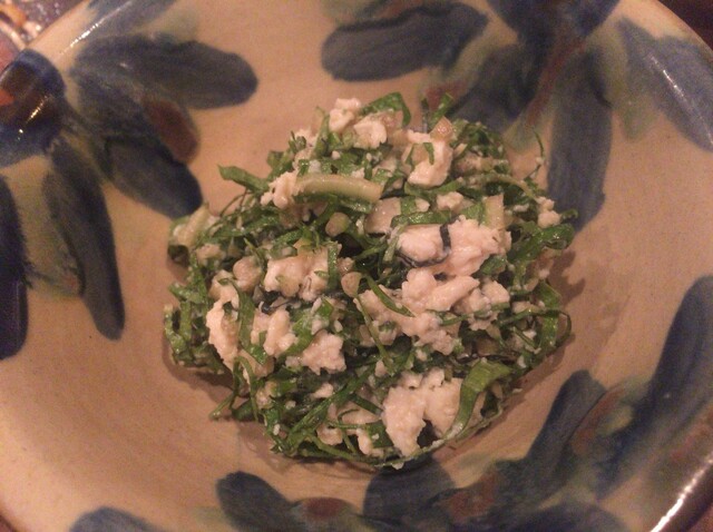 「ニガナの白和え」はお店の人に聞いたところニガナと言うのは薬草とのこと。薬草というだけあって相当苦いです。ビタミンやカルシウムが豊富なので健康食そのもの。豆腐と味噌とピーナツバターで和えてあり、苦味と甘味が交じり合った何とも沖縄らしい逸品です。これが超泡盛に合うことは言うまでもありません。