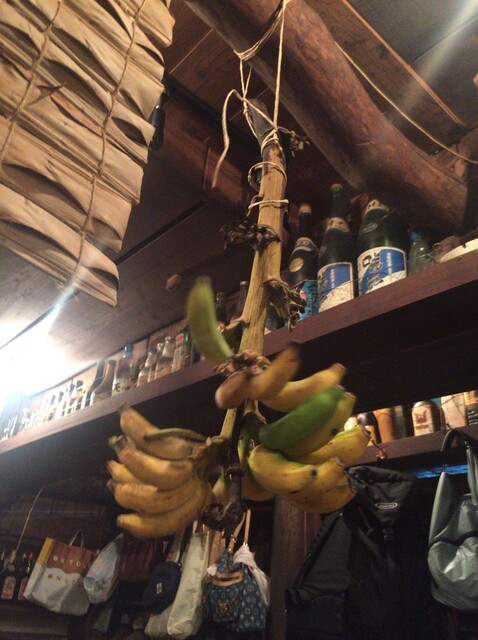 カウンタには島バナナがぶら下がり、カウンタの奥には大きな泡盛の甕が置かれ、棚には泡盛の瓶が並びます。