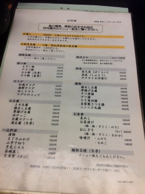 料理は東北の海の幸、山の幸、を中心にその日のおすすめを頂ける黒板形式です。