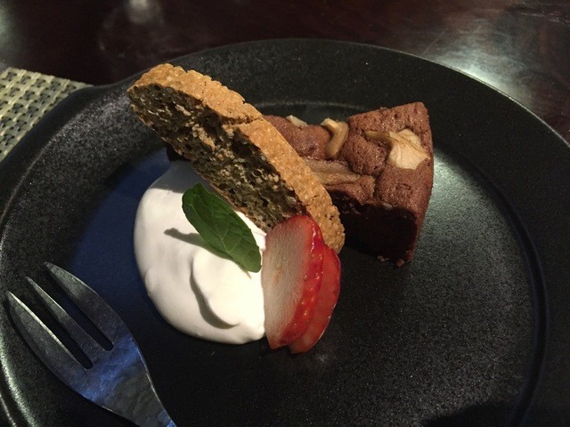 デザートは「田舎味噌のショコラケーキとえごまのスコッティ」です。