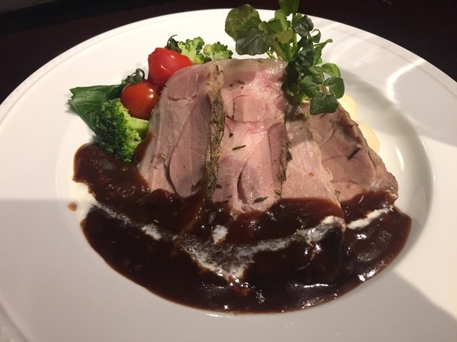 岩手の白金豚を、この近所でできるカシスを効かせたデミグラスソースで頂きます。