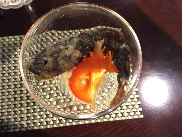一品目は、水槽に泳いでいるかじかを揚げて南蛮漬け風にしてあります。