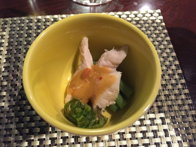 三品目は、鶏と春山菜のあえものです、この鶏も自前で育てたものなので、肉の健康さがわかるくらい味がしっかりしています。