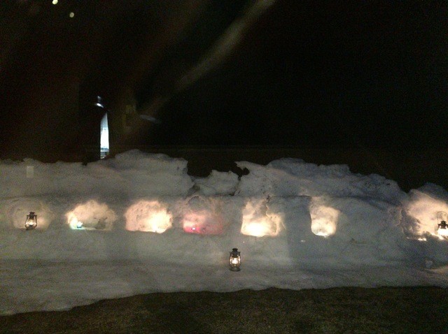 その雪でカマクラを作り、その中にキャンドルを置いて照明にしています。