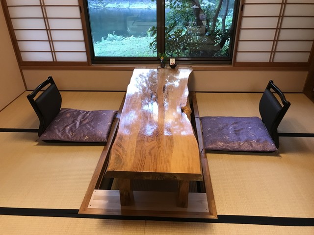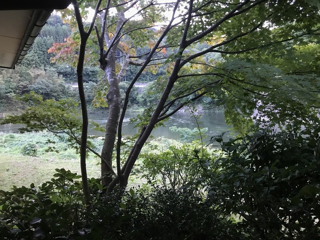 吊り橋の向こうの喜久屋さんの離れの部屋で山菜摘み草料理を頂きます。