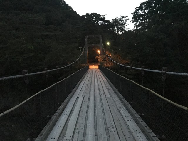 村上市内から車で1時間くらい行くと川沿いの駐車場に着き、そこから先は荒川にかかる吊り橋を歩いて渡ります。