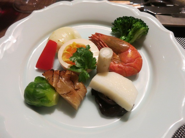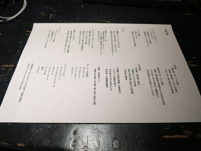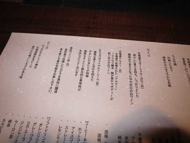 食事時の飲み物メニューですが、ワイン、日本酒、焼酎何でも品揃えがあり、嬉しいことにほぼ全てが北海道産です。この料理にはワインが合うので白ワイン、赤ワイン共に頂きましたが、北海道のワインも質が高いですね。とても良きワインでした。何より地産地消が良いことだと思います。