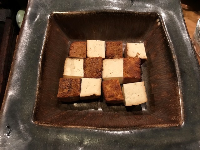 自家製の燻製もあり、スモーク豆腐というのも秀逸。豆腐をスモークしてさいころ状にしたものですが、これが日本酒にぴったりで、お酒が進みます。
