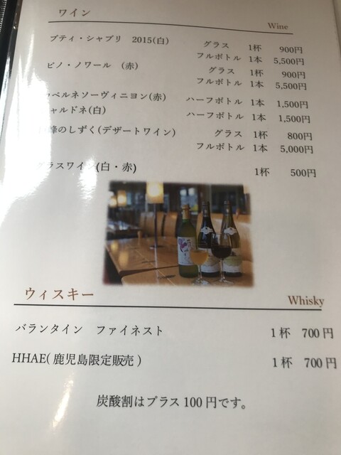 ビールは熊本の地ビールがあり、料理がフレンチテーストなのでワインもボトル、グラスお好みでいただけます。ワインの種類も赤白ともども豊富。