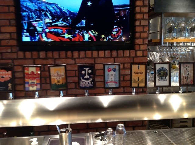 入口近くにオープンキッチンがあり、ホールの真ん中には、よなよなタップがズラリと並んでいます。