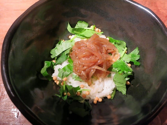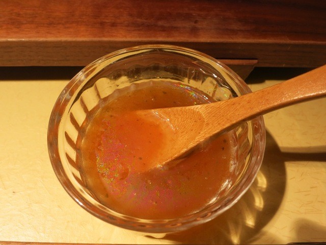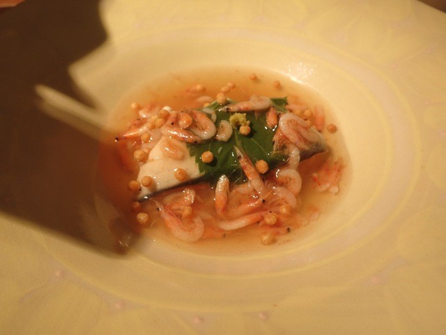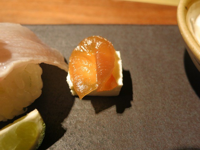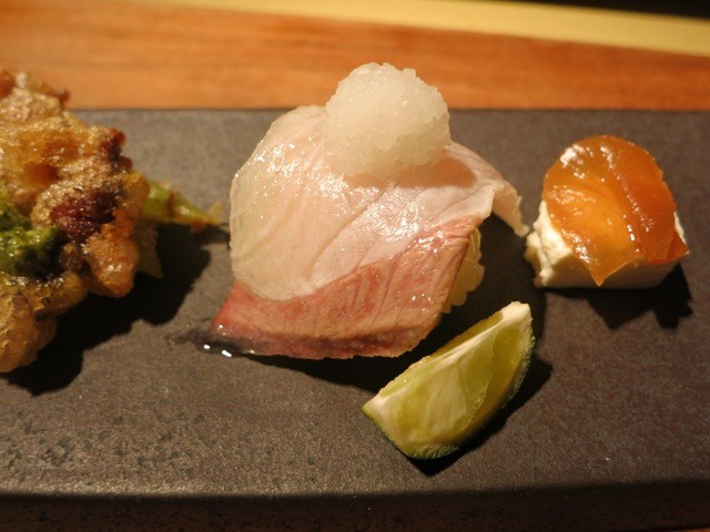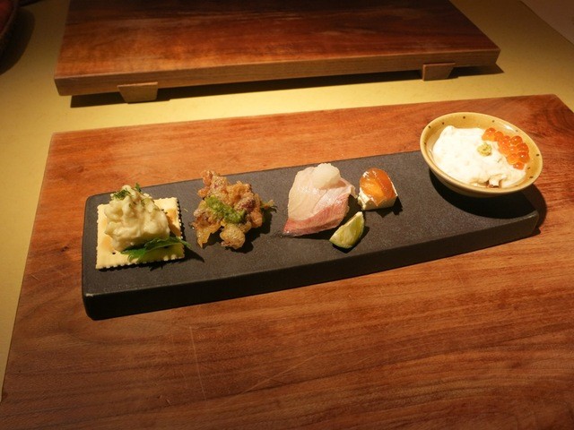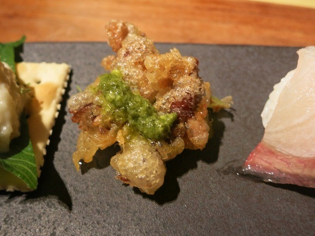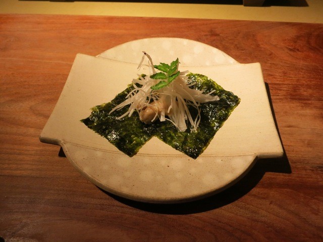 一品目は、鯛の子とうどのスライスを韓国のりに巻いたものです。出汁で炊いた鯛の子とうどの苦味、韓国のりのごま油の風味がハーモナイズされて、とても良い創作具合です。