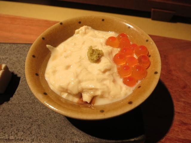 次の5品は自家製からすみ、ぶりの刺身あぶり、ゆば豆腐、酒粕料理、ほたるいかのビールフリット木の芽ソースなど少量ずつ凝った料理です。このへんでもう日本酒ですね。