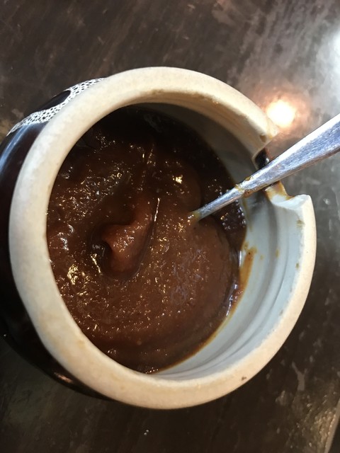 この辛味噌、唐辛子に加えて、にんにく、ショウガなど入っていますが、どうしてこんな辛味がありコクのある美味しい味になるのかわからない秘伝の味です。