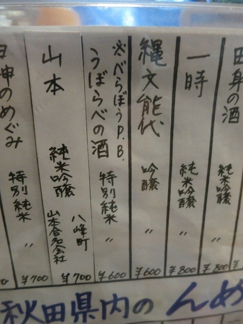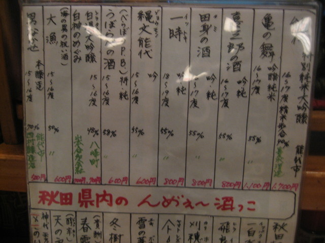 何といってもここでは秋田の日本酒、秋田のうめえ酒メニューが10本以上あり充実しています。能代近辺のお酒が多い。