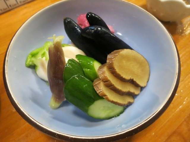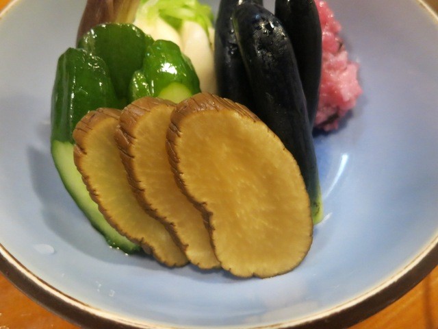 漬物は真打いぶりがっこですが、その他のナスやミョウガの浅漬けも目パチクリ系の美味しさ。秀逸なのは米のしそ漬けがあること。米の味としその味が調和しています。これはただものでは無い。