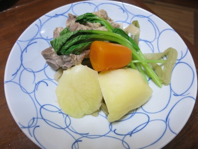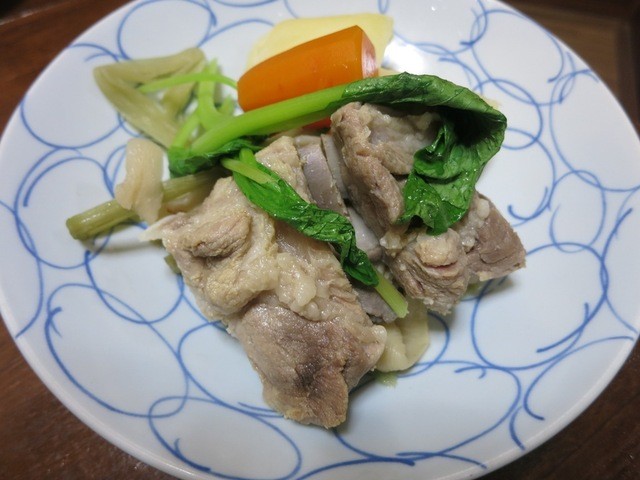 郷土のお祝い料理である豚肉、ジャガイモ、ニンジンなどのゆでたものを塩味と豚の旨みで最高の組み合わせ。素朴だけどいい。