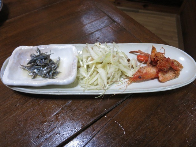 島料理の肴3点セットは、きびなごの塩辛、島らっきょう、そしてえびです。