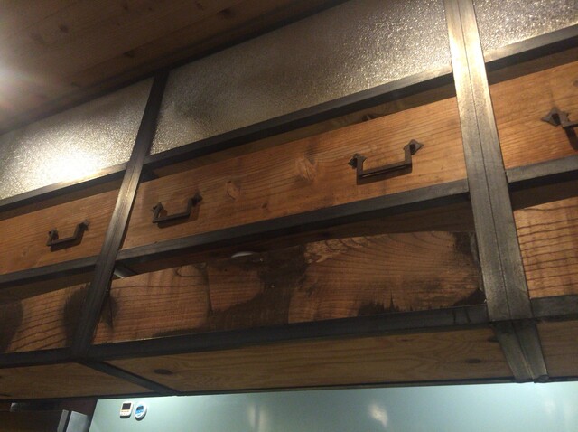 まずは、店内の造りはカウンタとテーブルですが、人数に応じて形が違っていたりして、天井のほうには木造のタンス風の造りになっていたりして、全体が木造で自然な感じです。カウンタも木でできていてゆっくり落ち着けます。