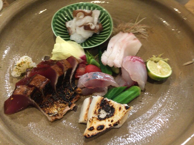 料理ですが、まずは定番のお刺身。これが瀬戸内の新鮮な幸が満載です。かつおのたたき、たこ、ヒラメなど最高のお刺身が頂けます。