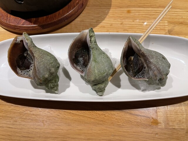 まずは、「網走を炙る」です。これは帆立やタコや鯨やとうきびを七輪で炙るものです。それを塩やごま油のタレにかけていただきます。こういうタレの種類を用意してあるところも丁寧で味のわかる良いところです。