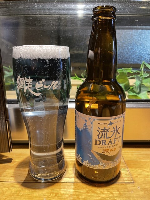 まずビールは地元網走ビールの流氷ビールです。流氷の薄青色のビールです。