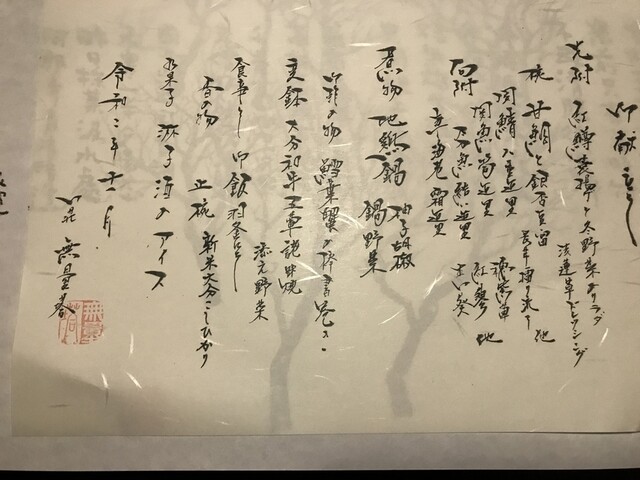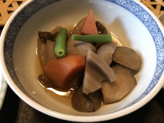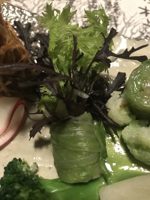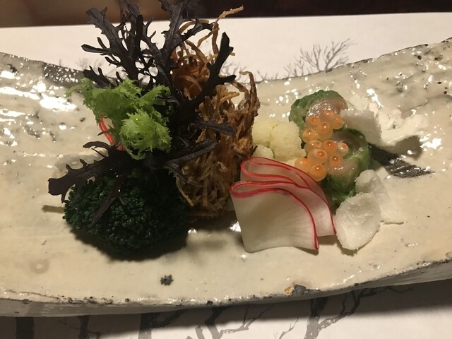 先付は虹鱒蓑揚げと冬野菜に法蓮草ドレッシングをかけるものです。蓑揚げと虹鱒のマッチが良く、法蓮草ドレッシングが美味しく野菜に合わせると良く合います。