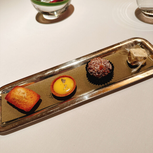 最初に口頭で前菜、魚、肉、デザートのメニューの説明があったものの、前菜の前に小料理が出たり、デザートが2種類出るほかプチフールも出るなどのサプライズがあり、とっても楽しめました!もちろん料理も美味しいですし、帝国ホテルブランドのワインもあり、色々と楽しい食事になりました。