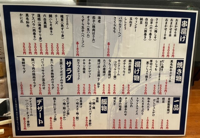 メニューは串揚げや創作料理が豊富にあり、どれも魅力的なラインナップです。