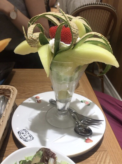 美味し~。パフェのお皿は2枚重ねになっていて、1枚はメロンの皮置きにしてくれとのこと。少しホスピタリティ出てきたかな。