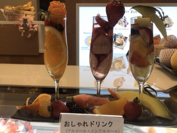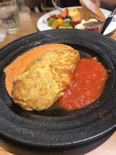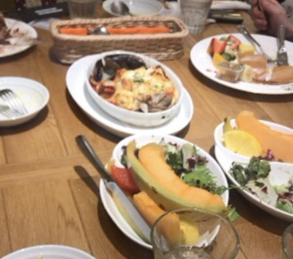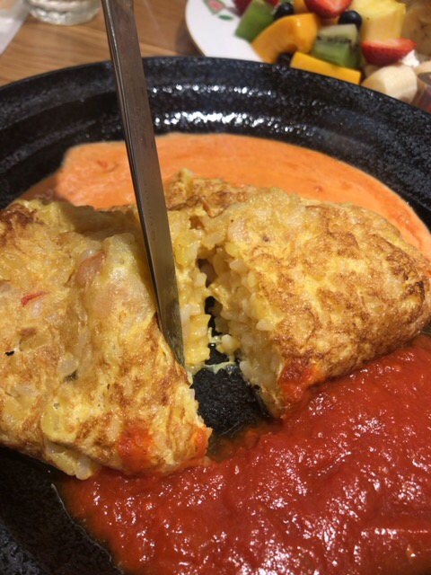 チーズやトマトのパスタ、カルボナーラ、ラザニア、オムライスを少しづつ食べる。これらはまぁ普通。甘々から気分変わっていい感じ。しかもこれら塩系にはサラダとフルーツがつく。