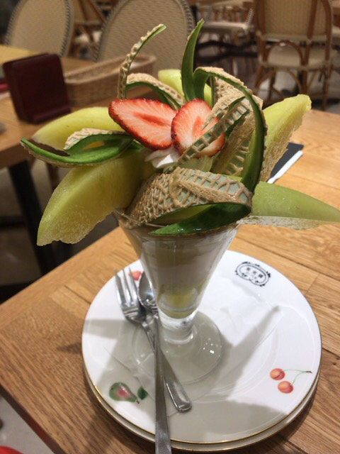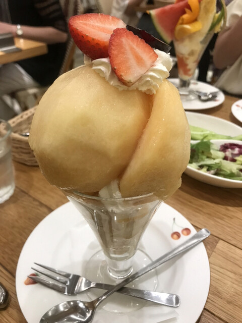 さすがにパンケーキとかは無理なので、ズコット(こっちもけっこう重いが)にしようかと思っていたが、メロンパフェに目が止まる。写真はメロンだらけ。