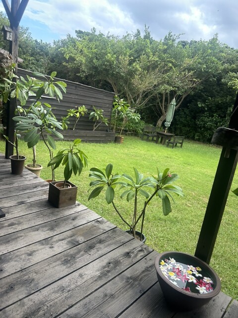 屋上からは八丈小島も見えるという抜群ロケーションだが、今回利用は庭に向かったテラス席。こちらもなかなか!