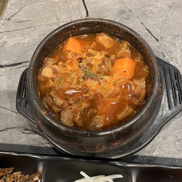 スジ煮込み、パンチャン、ライス、白菜キムチ