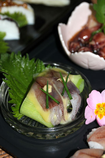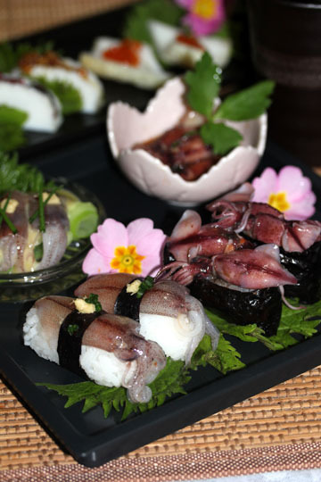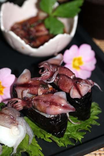 生蛍烏賊握り、ボイル蛍烏賊の軍艦、生蛍烏賊の酢味噌和え、蛍烏賊のパスタ、煮物、天麩羅、炊き込みご飯、沖漬け 等々作ってます。