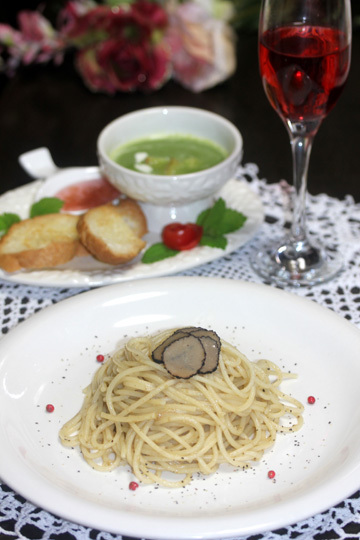シンプルにトリュフ塩で味を整えたソースに茹でたパスタを絡めてます。