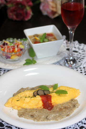 お皿にソースを敷き、オムレツをのせてトマトソースをかけトリュフを飾り付けてます。