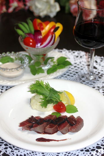 牛フィレは塩胡椒をしてニンニクと一緒に強火で焼き、赤ワインでフランベして30秒ぐらい蓋をして中火で蒸し焼きにします。
