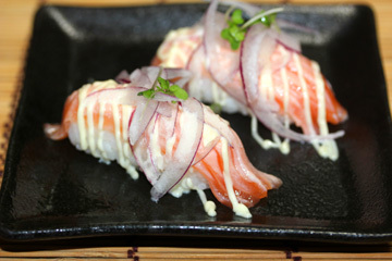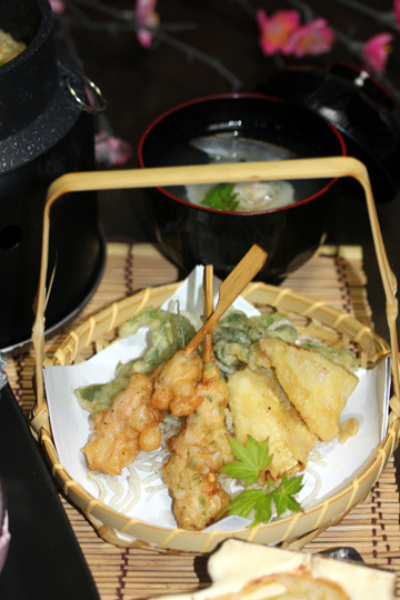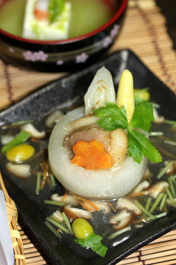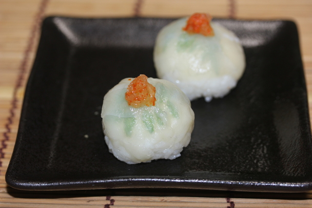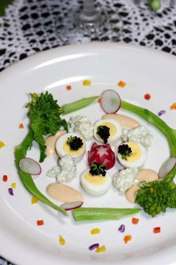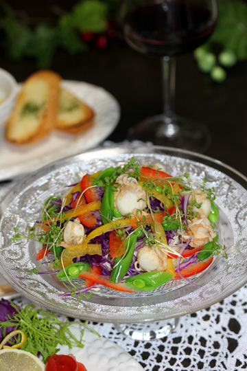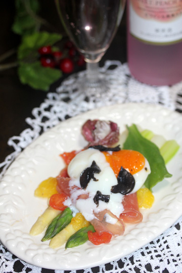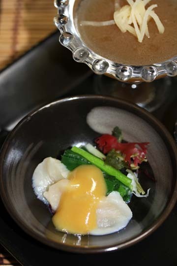 蛍烏賊とスナップエンドウの明太子マヨソース温泉玉子