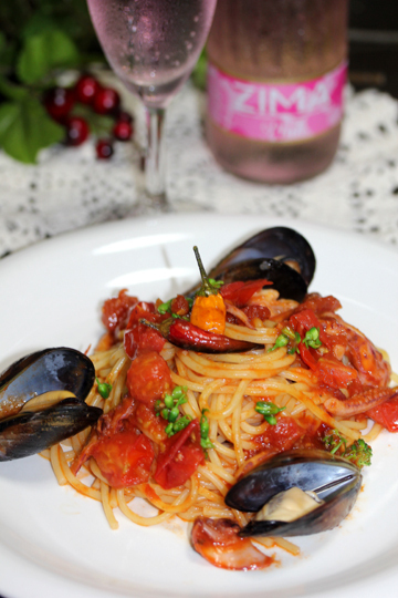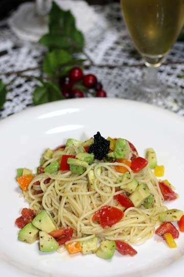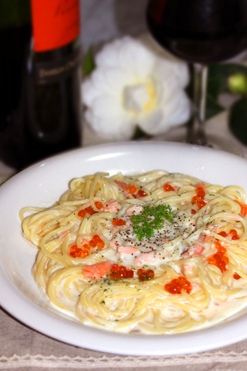 烏賊とスナップエンドウの辛子明太子ソースパスタ