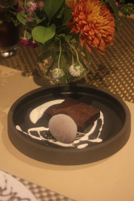 デザートはチョコのテリーヌとチョコのソルベで、誕生日プレートに飾り付けられていました。