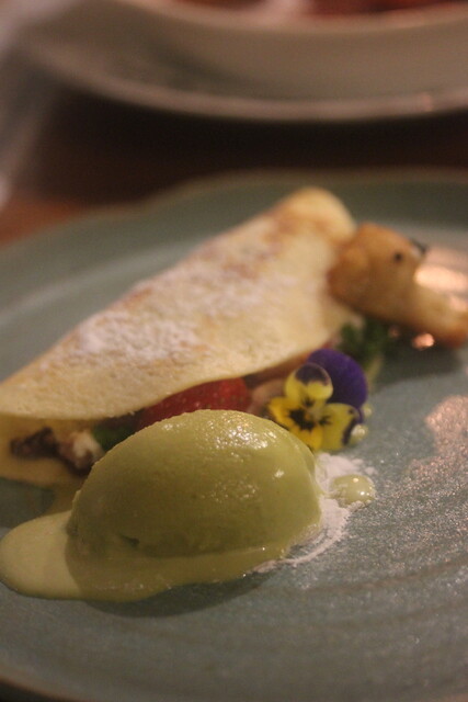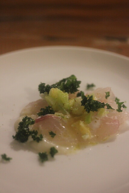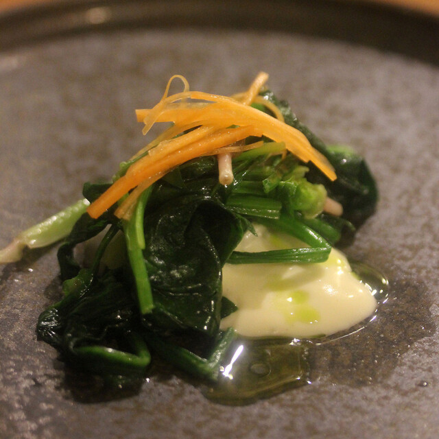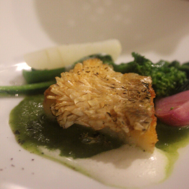 モロヘイヤと魚のお出汁を合わせたソースがかかっていて青柚子と自家製の発酵乳のソースが添えられていてお好みでつけて頂いてくださいと言われました。